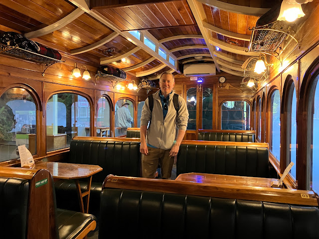 For over sixty years (1899-1963) this train hauled ore down to Strahan and goods back up to Queenstown. But after a modern highway was built, it became cheaper to truck out the ore and the railway was closed. But in 2002 it re-opened as a tourist attraction - the West Coast Wilderness Railway. We booked the VIP "Wilderness" class tickets, which meant that we got served drinks and a multi-course meal during the journey. The Wilderness car was very posh and comfortable, with huge windows to view the scenery.